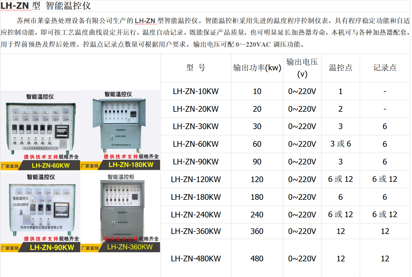在电力、化工、冶金建设,压力容器制造,造船等行业中的大型焊接安装热处理工程中,由于电力、环境条件十分恶劣,且往往缺少维修技术,根据用户的需求我公司设计生产了通用性强、高性能、高可靠的ZNWK智能型温度程序控制柜。LH-ZN型设备采用国际先进的进口温度控制仪自动给定功能和自适应控制功能,即可定值控温,亦可按工艺温度曲线控制升降温度及恒温时间,既能保证产品质量,亦可延长加热器寿命。本系列设备采用进口可控硅或固态继电器,配套先进的调压模块,可根据用户不同热处理工艺要求,可在0~220电压范围内任意调节,适用范围广,性能优良,维修简便。