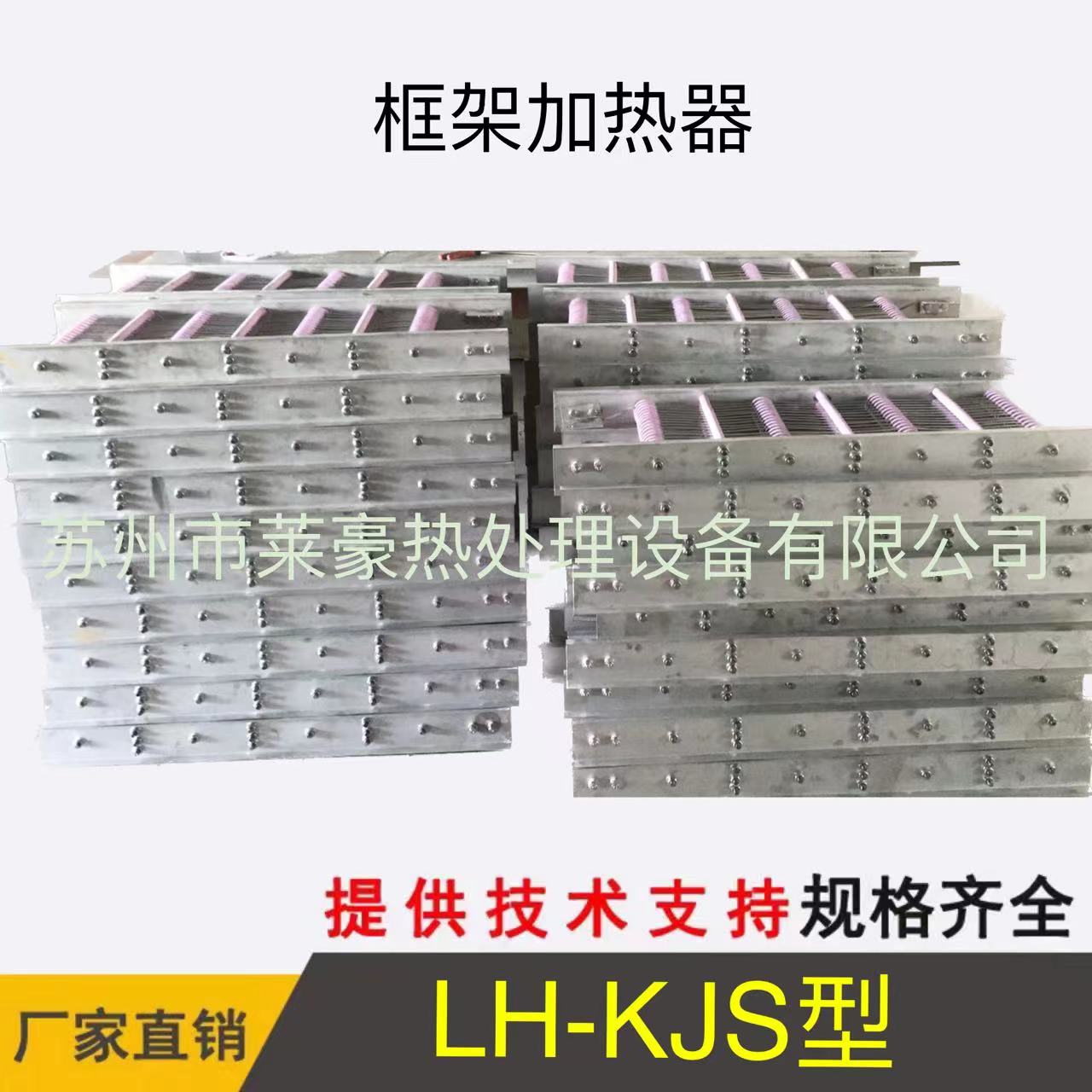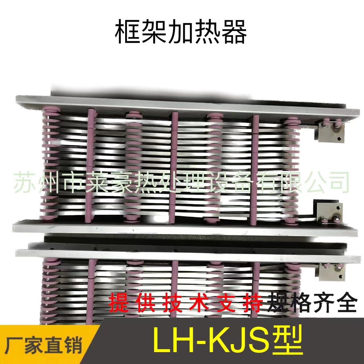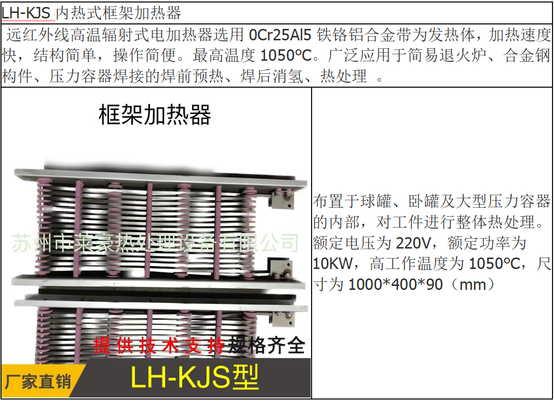 LH-KJS型内热式框架式加热器 框架式加热器是一种红外线高温辐射式电加热器,选用0Cr25A15铁铬铝合金带为发热体,布置于球罐、卧罐及大型压力容器的内部,对工件进行整体热处理。广泛应用于石油化工天然气相关的热处理领域,额定电压为220V,额定功率为10KW,最高工作温度为1000℃.尺寸为1000×400×90(mm)。