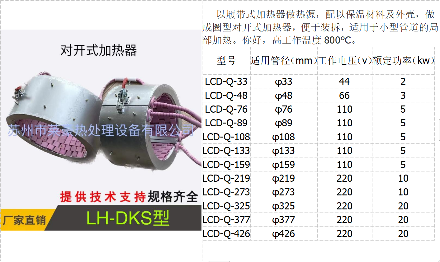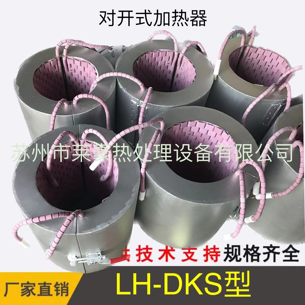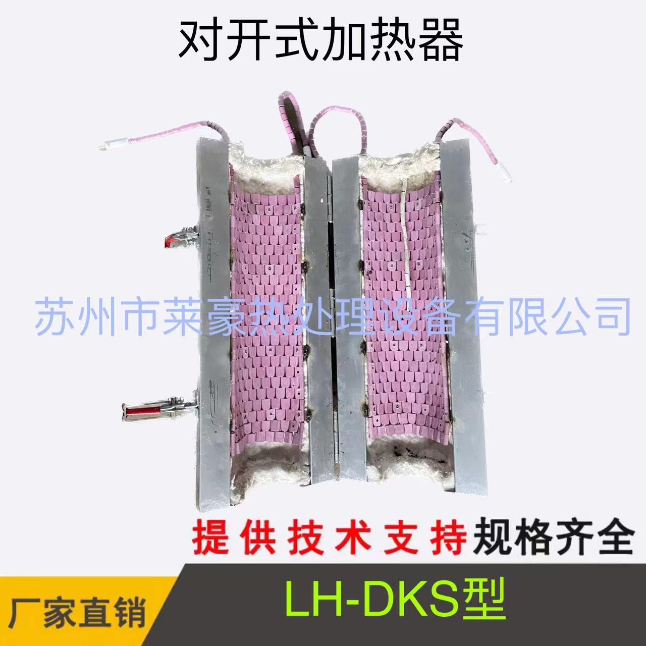 LH-DKS型对开式加热器 对开式加热器是对于各种工业设备及大型工件在焊接前的预热,焊接后的消除应力均需进行局部热处理。以达到提高工件质量,加强区域韧性的目的。而目前在大型工件或野外现场,设备检修中所采用的都是传统的,低效的,耗能大的高频加热,火焰加热或花大量投资专门制造超级加热炉进行热处理的传统方法。此外,在金属容器的干燥和高温加热方面采用的都是陈旧的方法。如①蒸汽管加热和水油隔套间接传导加热法,(但达不到某些高温加热要求,且容器也笨重,费工料,不易维修)。②破坏容器,采用电热棒插入式加热法(有些物料不允许与加热体接触或电热棒损坏后污染物料,且在维修时要放掉物料后才可进行)。③用电炉丝串接普通瓷管,缠绕外加热法(瓷管与容器成线接触,接触面小,热效率低,且普通瓷件易碎不安全)LH-DKS型大型对开式加热器取代了上述传统落后的方法,是在局部加热,野外现场加热、外部加热等方面的理想产品。