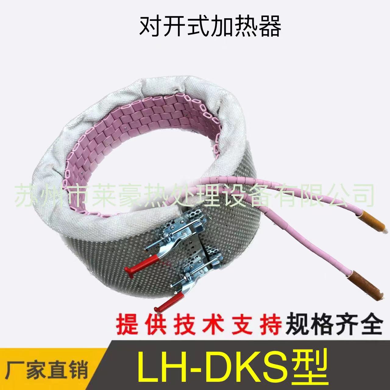 LH-DKS型对开式加热器 LH-DKS型大型对开式加热器在热处理工作时,必须备用保温材料硅酸铝(针刺毯)是一种优质保温材料、柔软性好、强度高。本型加热器为圈型对开结构,可对大型管件进行局部加热,如新形桥梁中钢管拱主弦管的热弯等,被加热管径2000mm以下,工件温度可达800℃左右.