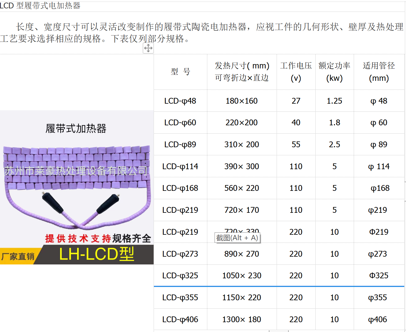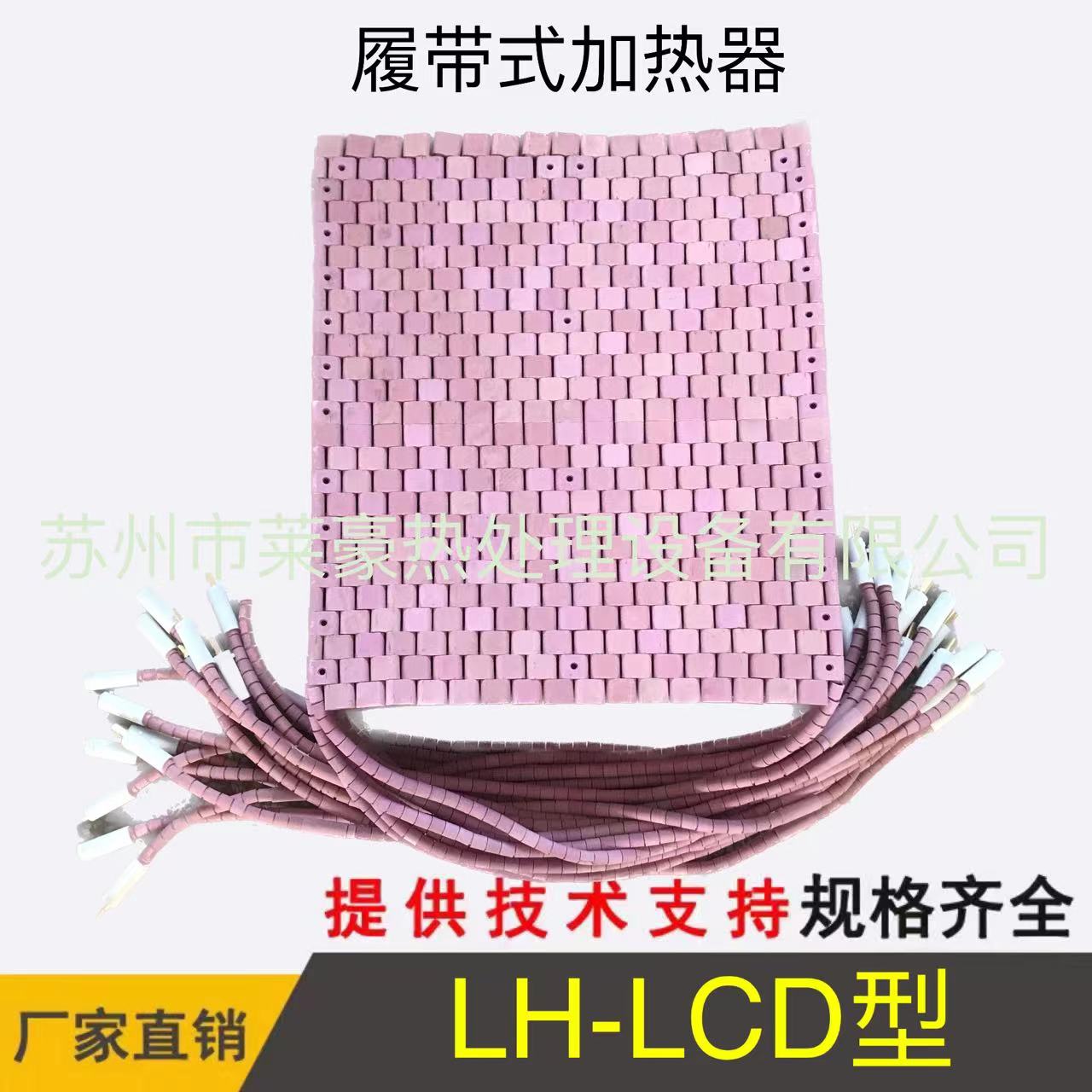 履带式加热器 履带加热器是选用优质镍铬合金丝缆,外套高纯度氧化铝陶瓷绝缘件制成履带式或绳式加热器以及其它产品形式。履带加热器可以与工件接触加热,能根据工件形状、尺寸制作,可以拼接、弯曲、缠绕紧贴工件加热,履带加热器具有使用范围广,升温速度快,热利用率高,操作方便等特点。表面最高温度可达1050℃。履带加热器适用于各种金属构件,如大型塔器、高压容器、桥梁、高压管道的焊接预热,中间消氢和焊后的局产部热处理,消除应力。履带加热器是目前焊接界一种最新颖实用的理想局部热处理加热器。亦可用于化工管道,容器的辅助加热,且室内室外不限,履带加热器是目前最先进、实用的局部加热设备长度尺寸可以灵活改变制作的履带式陶瓷电加热器、履带加热器,应视工件的几何形状、壁厚及热处理工艺要求选择相应的规格。最高工作温度1050℃。履带加热器与传统加热方式对比 各种工业设备及大型工件在焊接前的预热,焊接后的消除应力均需进行局部热处理。以达到提高工件质量,加强区域韧性的目的。而目前在大型工件或野外现场,设备检修中所采用的都是传统的,低效的,耗能大的高频加热,火焰加热或花大量投资专门制造超级加热炉进行热处理的传统方法。此外,在金属容器的干燥和高温加热方面采用的都是陈旧的方法。如①蒸汽管加热和水油隔套间接传导加热法,(但达不到某些高温加热要求,且容器也笨重,费工料,不易维修)。②破坏容器,采用电热棒插入式加热法(有些物料不允许与加热体接触或电热棒损坏后污染物料,且在维修时要放掉物料后才可进行)。③用电炉丝串接普通瓷管,缠绕外加热法(瓷管与容器成线接触,接触面小,热效率低,且普通瓷件易碎不安全)。采用履带式陶瓷加热器特点比较:●履带式加热器取代了上述传统落后的方法,是在局部加热,野外现场加热、外部加热等方面的理想产品。●履带式加热器结构、用途: 由耐高温多股优质电热丝和高强度,高耐温的瓷件按特殊工艺要求编接而成,在其长度方向有任意弯曲特性,可广泛用于各种工业设备、工件的现场热处理,各种金属容器,管道的干燥,加热升温,各种模头,模具的高温外加热等场合。●履带式加热器特点: 1、具有绕性,如加热容器或管道时,可弯曲成弧形或圆形包复在表面加热,如加热大型工件,局部可采包复形式,大面积工件可采用平铺复盖形式。此外能适合各种几何形状工件的加热。 2、工作温度高、升温快、热效率高、无污染、加热均匀精确,可以实现自动控制。 3、机械强度高,热态绝缘性能好,与被加热物体接触面大,使用寿命长。 4、安装、维修方便,使用费用也低,即使内部发热材料损坏,而外部的陶瓷器件仍可回用。●履带式加热器技术指标: 1.抗电强度:2000V/1分钟 2.热态绝缘电阻:>5MΩ 3.最高工作温度:1050℃●安装使用须知: 1.根据设备、工件的大小,可单组件或多组件均匀布置,安装时的固定方式,可用不锈钢丝扎结或不锈钢带弯成紧固圈状,再用螺钉串接紧固。 2.从温度要求和节能考虑,应在加热器外面复盖绝缘保温层材料6~200px和温度控制器。 3.使用时加热器不允许重叠,以免形成过热区而影响寿命。注意勿破碎瓷件,以免电热材料暴露而影响安全。 4.被加热工件须有可靠接地。工作电压不得超过客定电压的1.05倍。